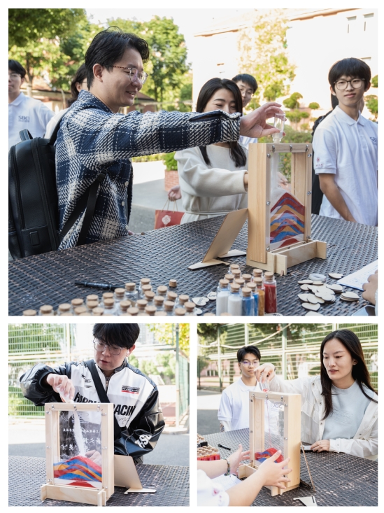 活动伊始,签到处的“倒流沙”装置成为特色亮点。校友们依次将象征“幸福”“健康”与“好运”的彩色流沙粒缓缓倒入玻璃容器中,逐渐汇聚成山,寓意将往昔校园记忆凝聚为对美好未来的共同期盼,也寄托了对母校的深情祝福。