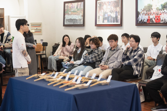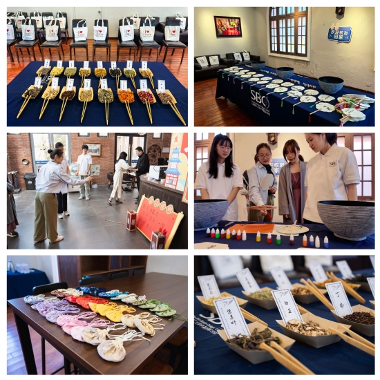 在非遗手作体验区,漆扇、香囊、投壶与剪纸四项传统活动同步展开,气氛热烈。漆扇制作区中,校友们以靛青、胭脂与藤黄等色彩,勾勒出“外滩天际线”与“伦敦塔桥”交融的图案;香囊台前,大家将艾草、丁香与桂枝细细填充,将牵挂与祝福缝入囊中。投壶区欢笑声不断,剪纸区则涌现出一幅幅精美作品。校园文化元素与传统非遗技艺的深度融合,让匠心精神与青春活力交相辉映。