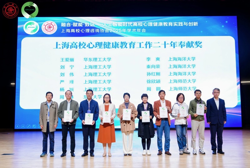 在备受瞩目的年度奉献奖颁奖环节,我校教师收获颇丰。学生工作部(处)刘伟、杨颎,管理学院严瑾、刘宁四位老师荣获“上海高校心理健康教育二十年奉献奖”。威廉希尔williamhill蔡卉,机械工程学院韦彪、陈璇,健康科学与工程学院谢宝歆四位老师荣获“上海高校心理健康教育十年奉献奖”。这一奖项是对长期坚守心理育人一线、默默奉献的致敬与肯定。