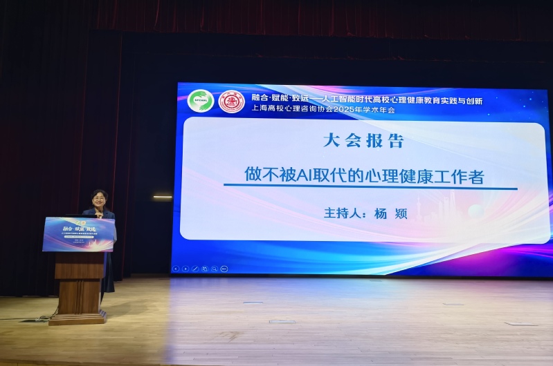 会上,中国人民大学社会与人口学院教授、博士生导师、心理健康教育跨学科平台首席专家俞国良,作了《大学生心理健康问题的时代诠释》的报告。医学博士、世界心理治疗学会主席、知名心理学专家赵旭东教授以《做不被AI取代的心理健康工作者》为题,分享了其深刻洞见。全国高校思政网、中国大学生在线心理健康工作部副主任郑骊君则围绕《数字赋能新时代高校心理健康工作质效提升》进行了阐述。三场主旨报告视角多元,内容前沿,引发与会者的热烈反响。上海高校心理咨询协会常务副理事长兼法人代表、我校心理中心主任杨颎老师应邀担任主旨报告主持人。