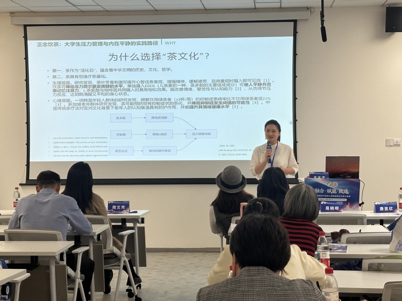 在下午举行的分论坛中,来自不同高校的一线心理健康教育工作人员,围绕“健康教育”、“监测预警”、“咨询服务”、“干预处置”四大主题展开了深入研讨。我校环境与建筑学院教师王木子作了题为《正念饮茶:大学生压力管理与内在平静的实践路径》的专题汇报,系统介绍了我校在融合中华传统茶文化与现代正念技术,开展的“本土化心育实践”的探索。汇报包括课程开发、品牌建设与未来展望,并现场引导了三分钟正念饮茶冥想,得到在场老师的肯定,为大中小学一体化心理育人工作提供了创新思路。